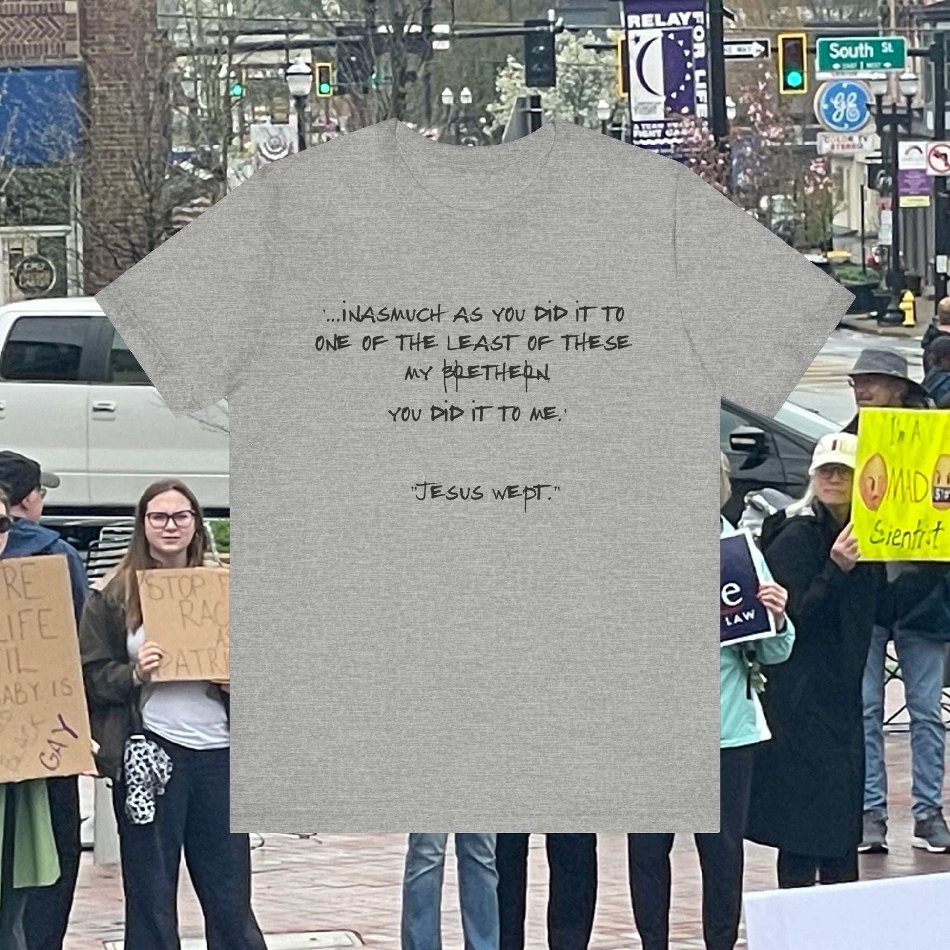 Bible Verses tee featuring the phrases "...Inasmuch as you did to the least of my brethern..." and "Jesus wept", giving a pious and thoughtful vibe. This unisex jersey short sleeve tee is perfect for those who appreciate Bible Verses references in their attire. Suitable for religious holidays, church events, and daily wear for believers, social protests.