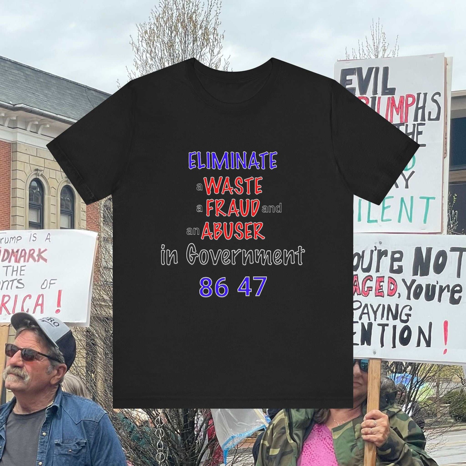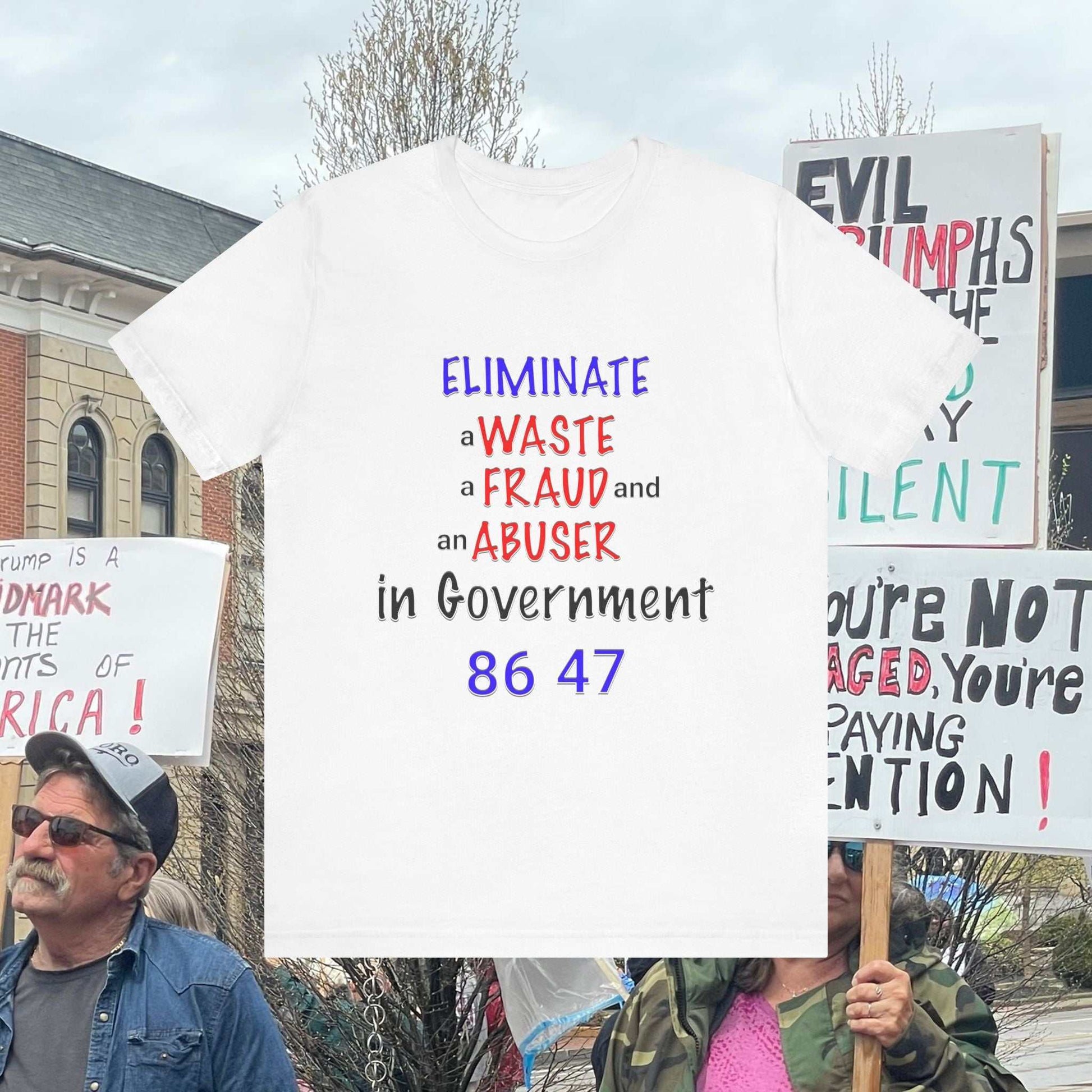 Eliminate Waste Fraud Abuser T-Shirt features the text "Eliminate a Waste a Fraud and an Abuser in Government 86 47", adding a touch of wit and political commentary to your wardrobe. The unisex design makes it suitable for anyone looking to make a statement with their clothing. Perfect for casual wear, political rallies, protests, or as a guaranteed conversation starter. After all, everyone wants to Eliminate Waste in government.