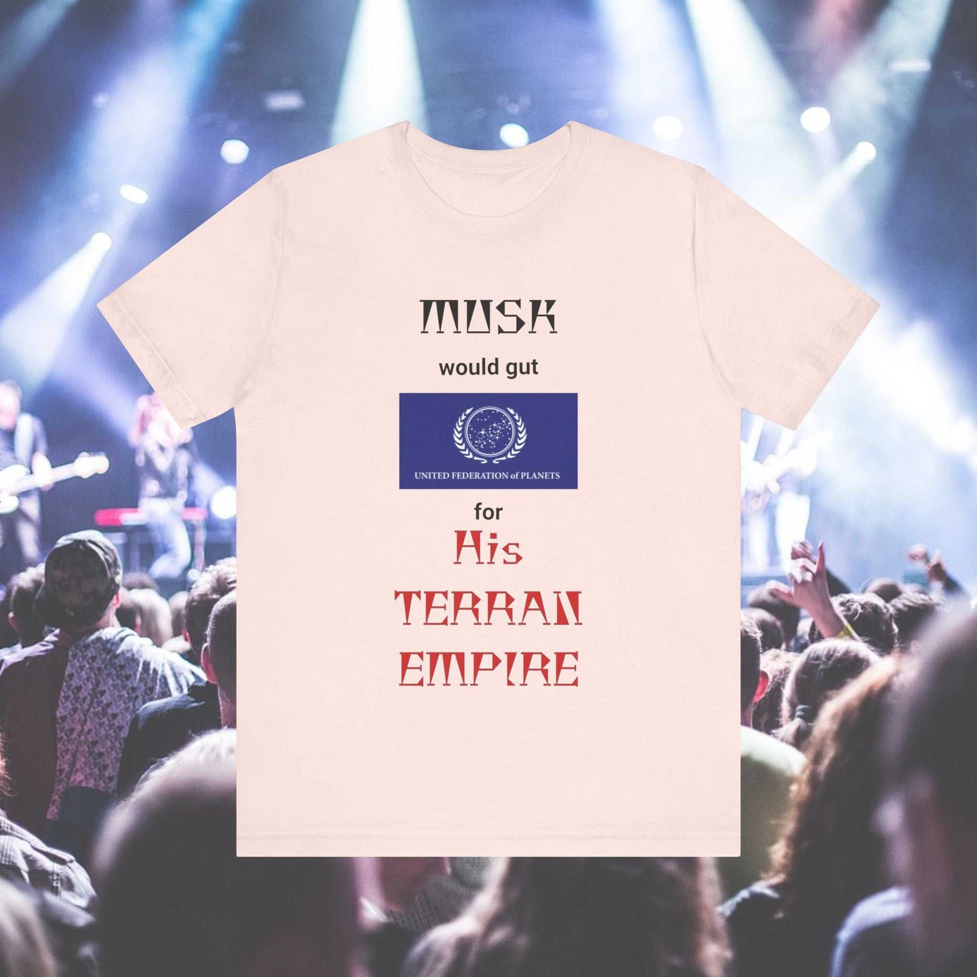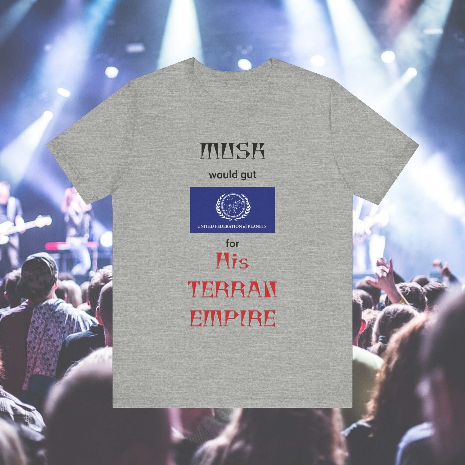 Musk and his Terran Empire tee. Show your distaste for a Terran Empire with this "Musk would gut the Federation for his Terran Empire" tee. Perfect for sci-fi fans and those who appreciate a rebellious vibe. Ideal for casual wear and as a conversation starter. Great for gifting on birthdays, holidays, and fan conventions.