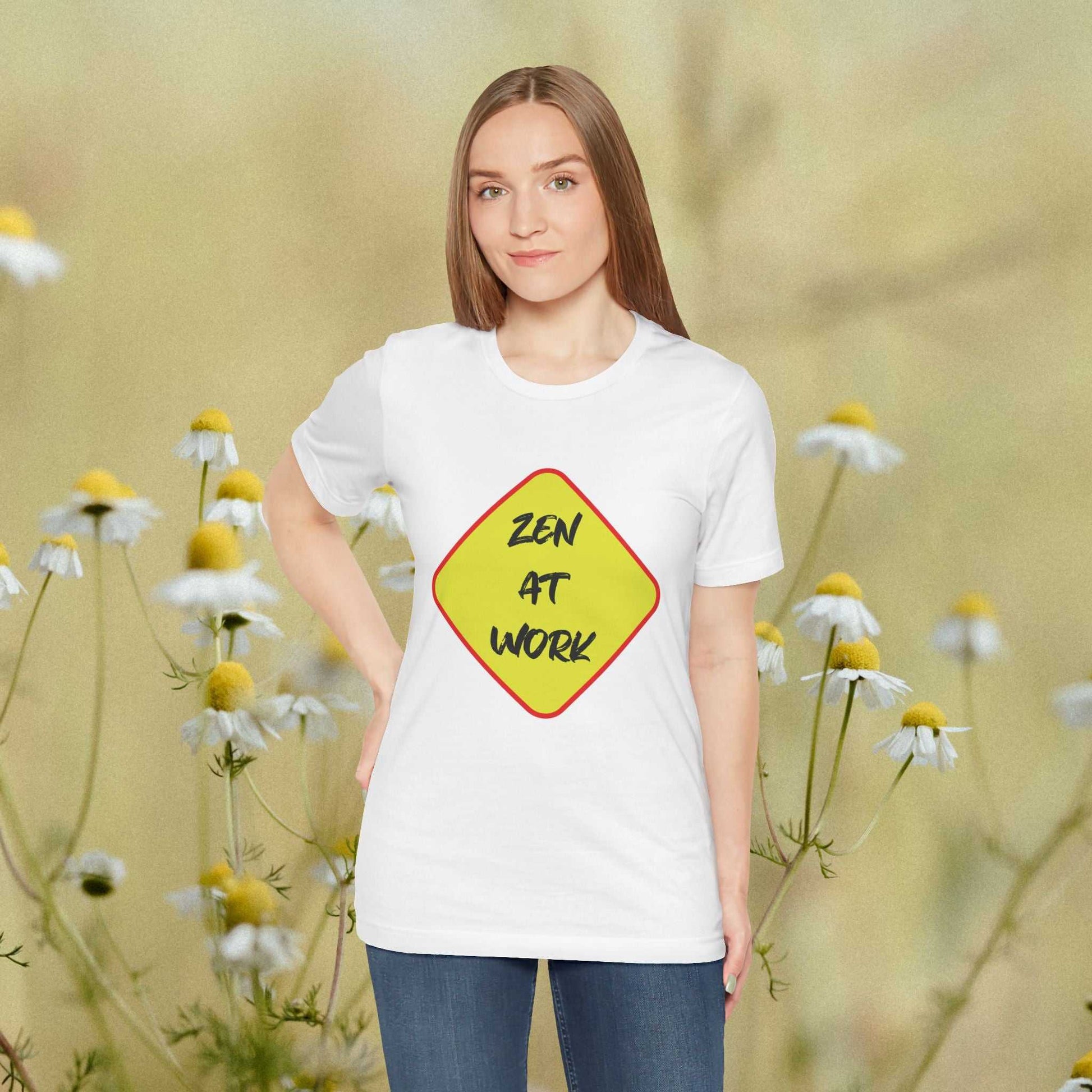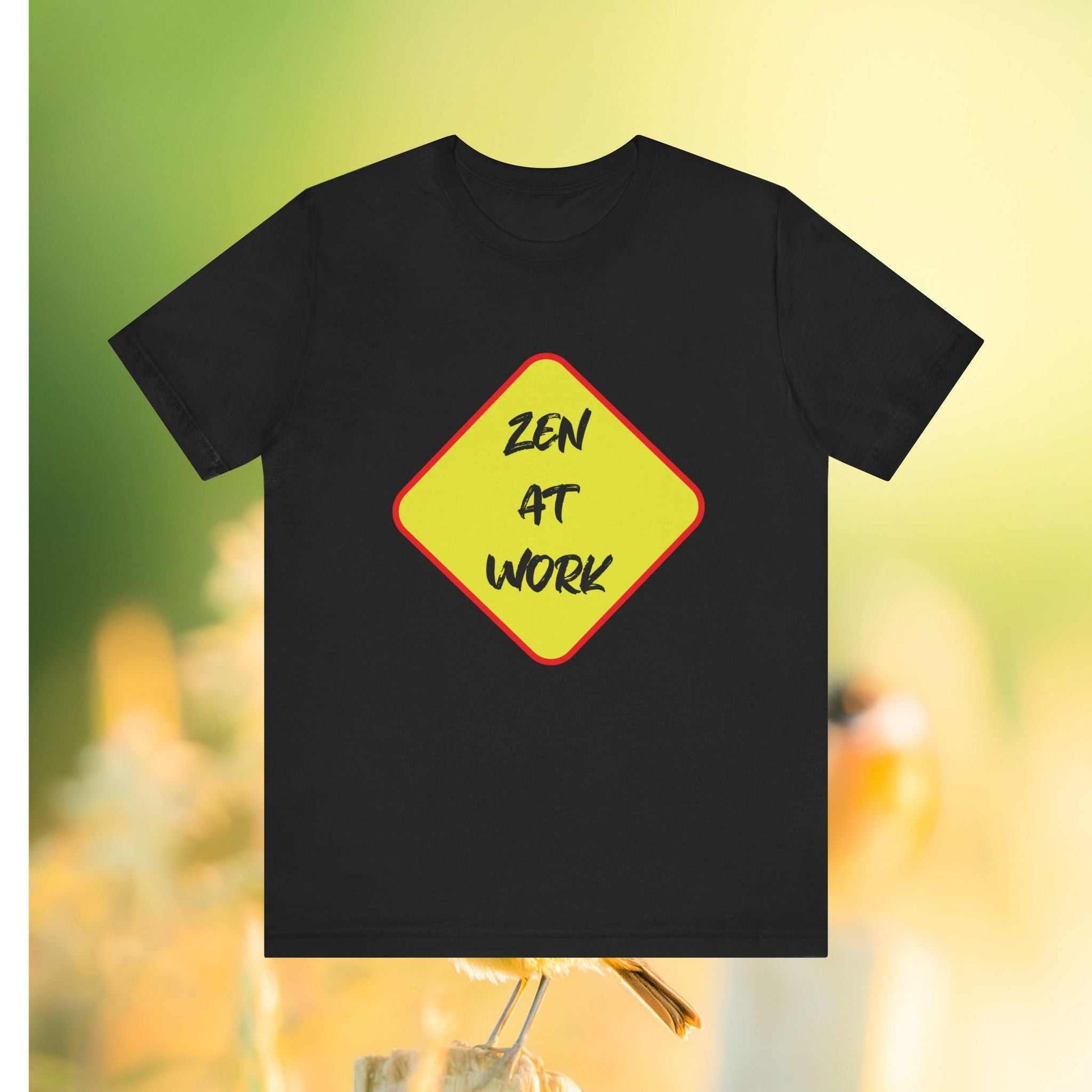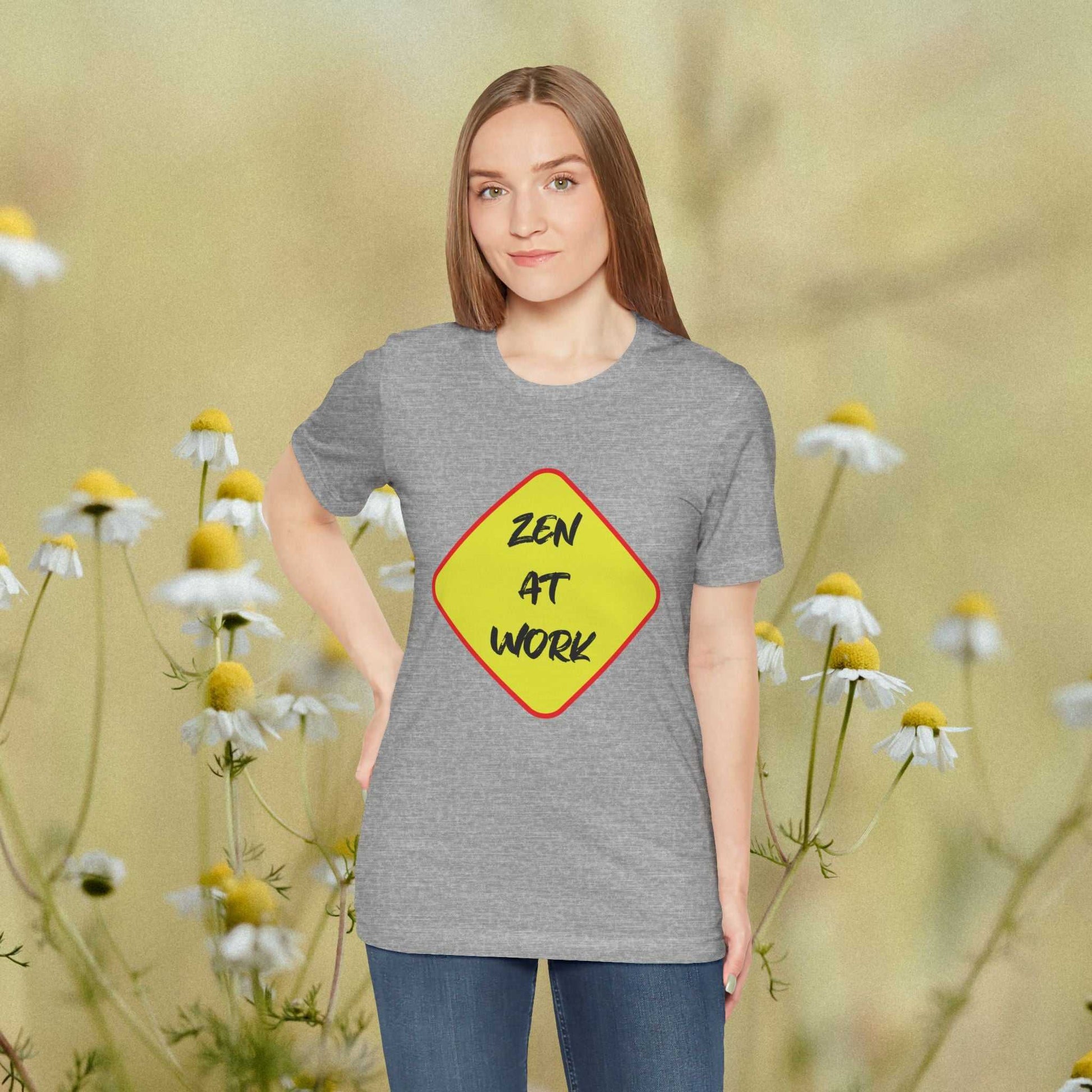 A unisex jersey short sleeve Tee featuring a unique design with the 'Zen At Work' sign replacing the usual 'Men At Work'. This Tee provides a relaxed and casual vibe, perfect for everyday wear and expressing a peaceful message. Ideal for those seeking a comfortable and versatile top with a touch of humor. Relevant for casual wear, work attire, meditation enthusiasts, and casual Fridays at the office.