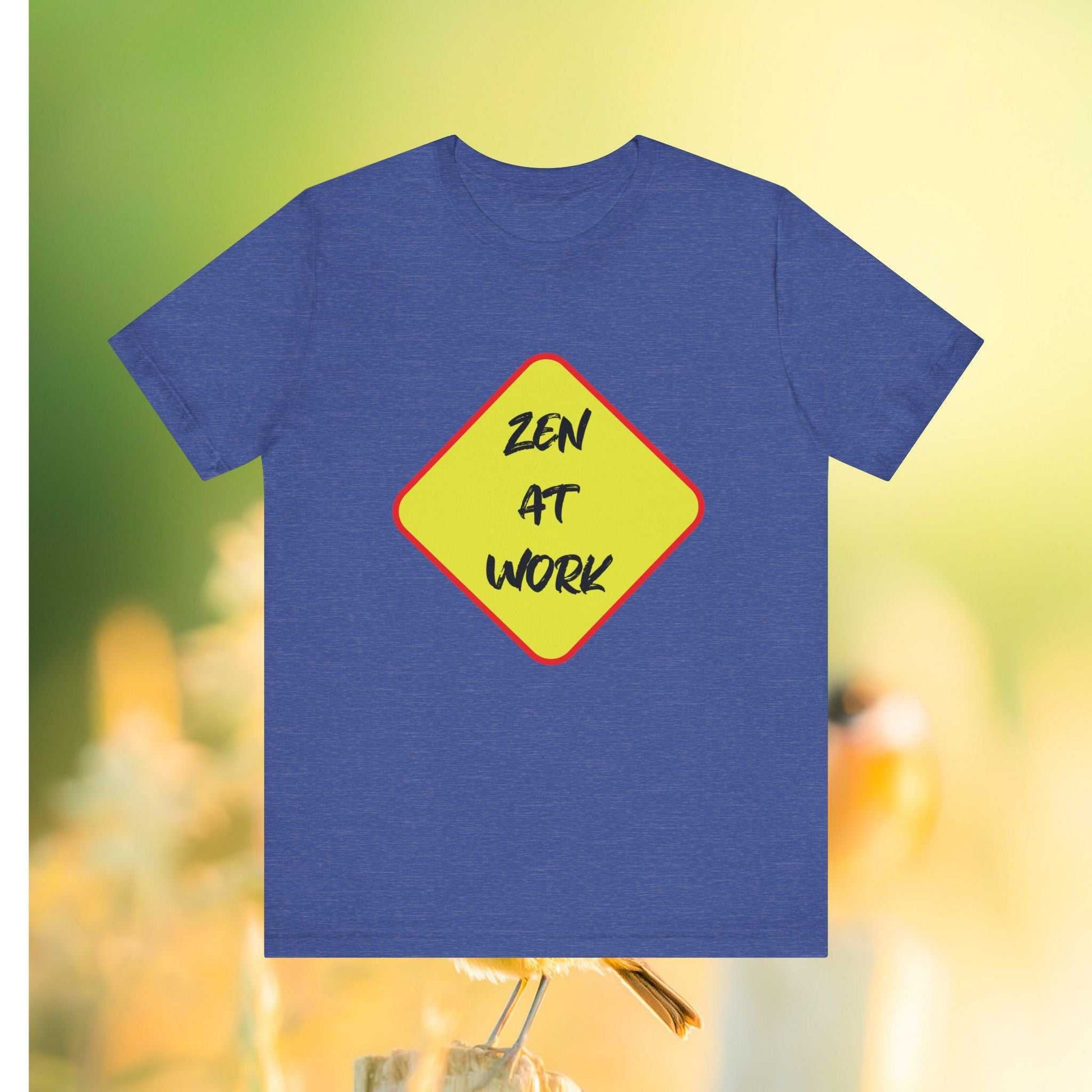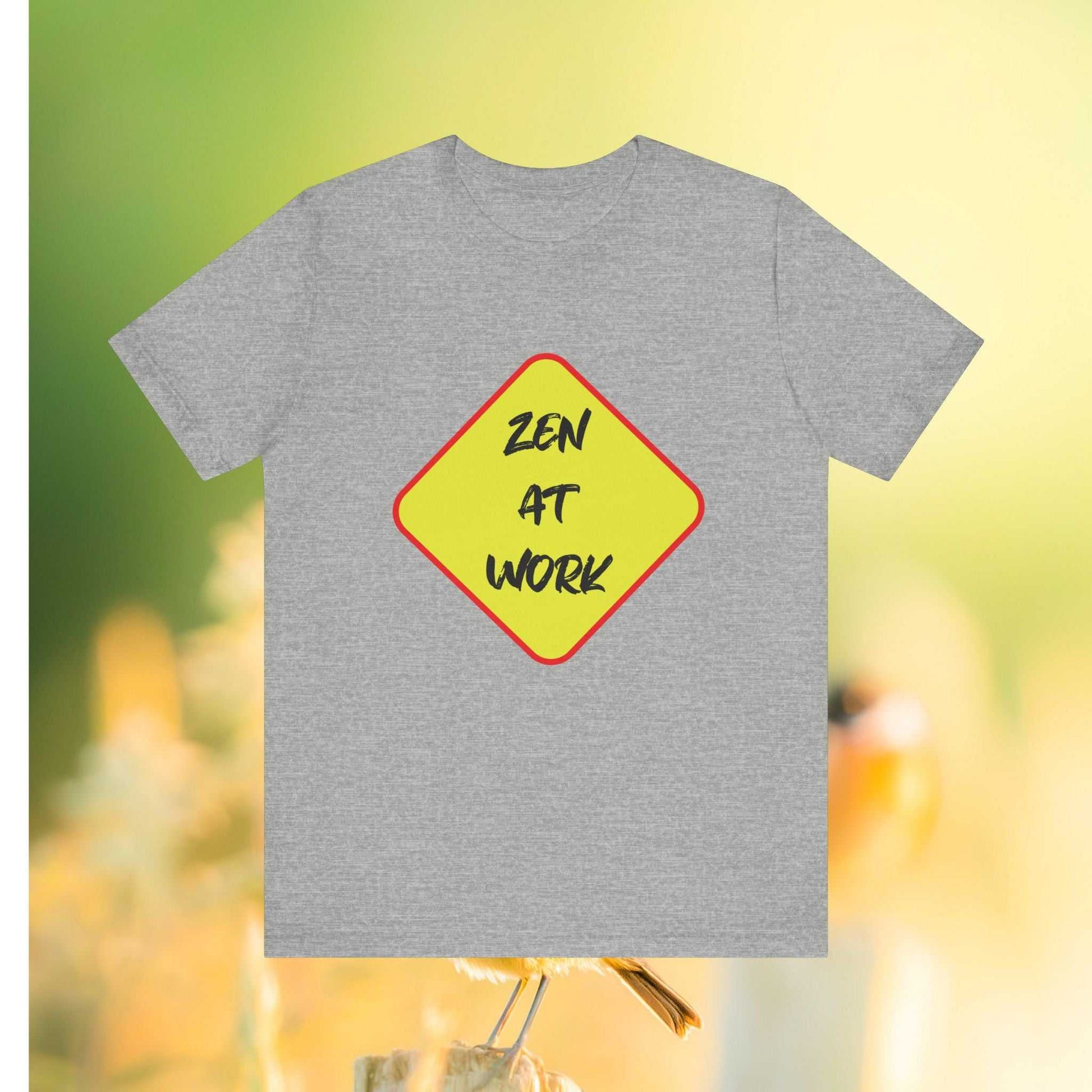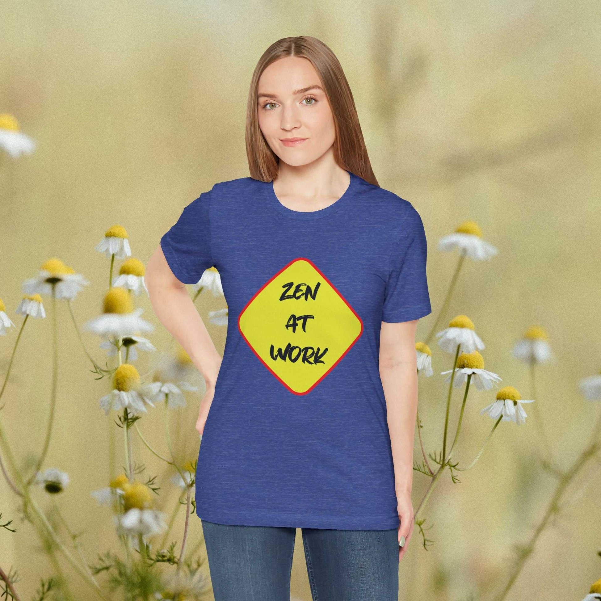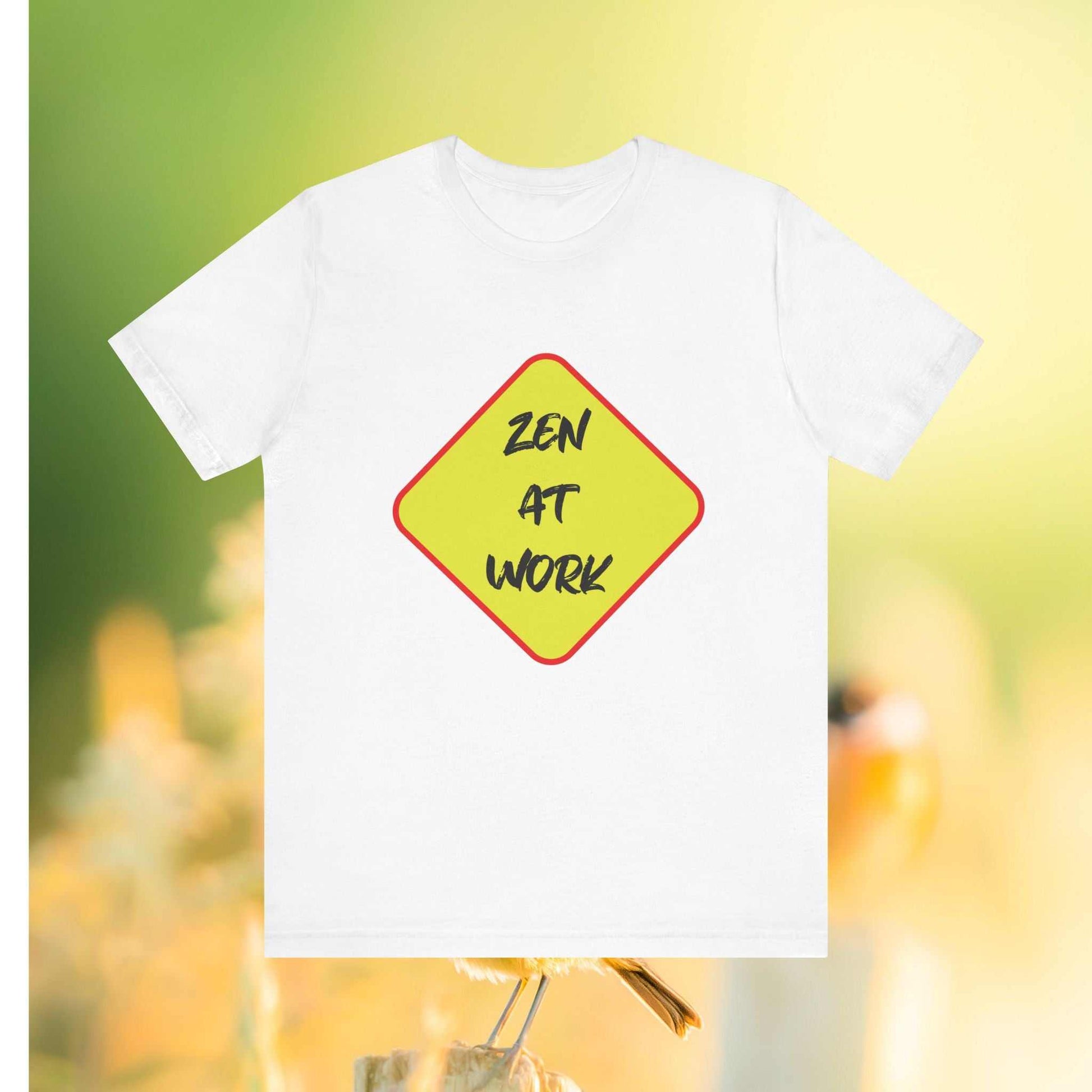 A unisex jersey short sleeve Tee featuring a unique design with the 'Zen At Work' sign replacing the usual 'Men At Work'. This Tee provides a relaxed and casual vibe, perfect for everyday wear and expressing a peaceful message. Ideal for those seeking a comfortable and versatile top with a touch of humor. Relevant for casual wear, work attire, meditation enthusiasts, and casual Fridays at the office.